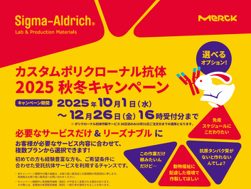 カスタムポリクローナル抗体キャンペーン シグマアルドリッチジャパン合同会社 カスタムポリクローナル抗体キャンペーン 【期間】2025年10月1日(水)~12月26日(金)まで開催中! 詳しくはこちらまで! facebook twitter line