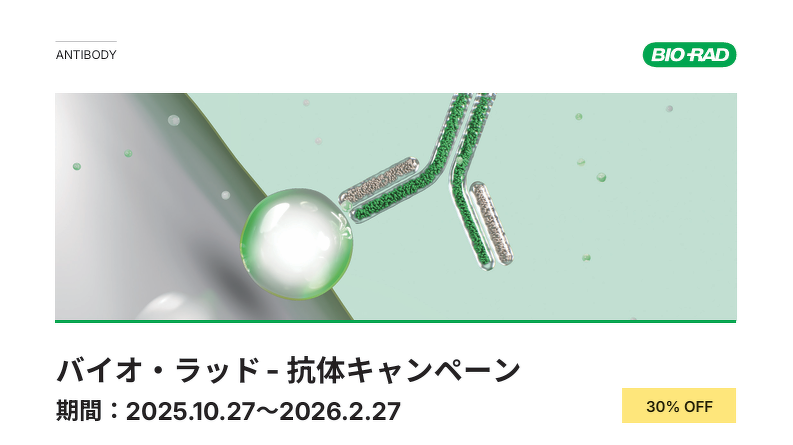 バイオ・ラッド - 抗体キャンペーン バイオ・ラッド ラボラトリーズ株式会社 バイオ・ラッド - 抗体キャンペーン 抗体ラベルキットトライアルキャンペーン 【期間】2025年10月27日~2026年2月27日まで開催中! 詳しくはこちらまで! facebook twitter line